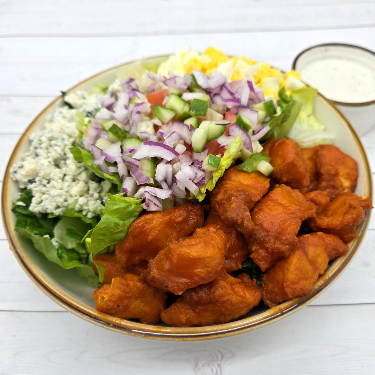 Crisp little gem lettuce topped with our buttermilk fried chicken bites, tossed in house-made buffalo sauce. Finished with diced tomato, red onion, and cucumber, plus boiled egg and blue cheese crumbles. Served with our homemade ranch dressing.