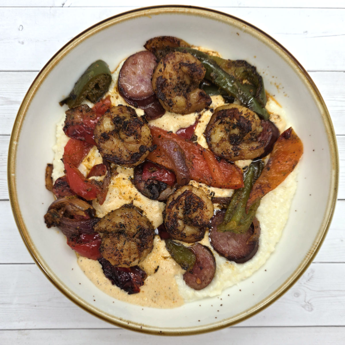 Grilled shrimp, smoky sausage with peppers and onions piled on creamy Marsh Hen Mill grits, all smothered in our rich, house-made Cajun cream sauce.