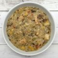 Our house non-GMO salmon cooked from scratch into a rich, thick chowder with smoky bacon, potatoes, sweet corn, and carrots. Hearty, savory, and deeply comforting. Real fish, real vegetables, and a proper, satisfying bowl of chowder.