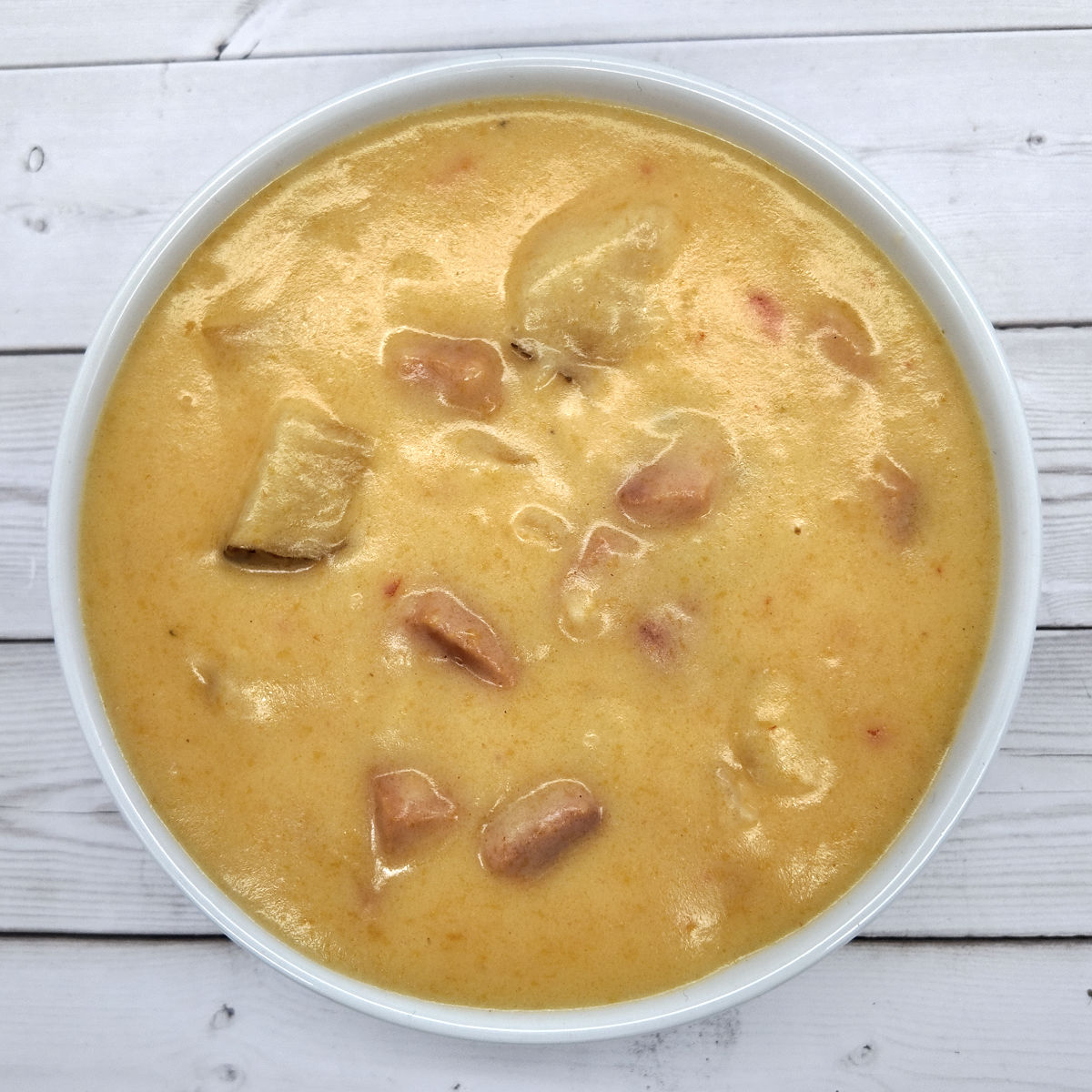 Savory ham, tender potatoes in a creamy, cheese-laced broth thickened with a classic roux. Hearty, comforting, and full of rich, satisfying flavor.