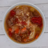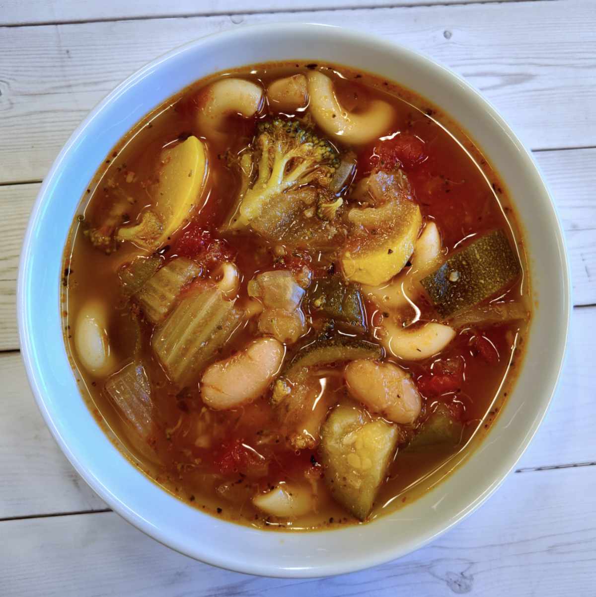 Macaroni pasta and hearty white beans in organic vegetable stock with Italian garden vegetables. Packed with wholesome ingredients and vegetarian comfort in every bite.