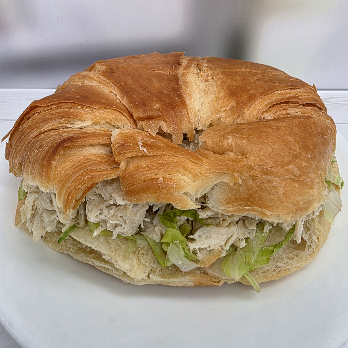 Our homemade Naked Chicken Salad (plain) with shredded lettuce on a sandwich croissant.