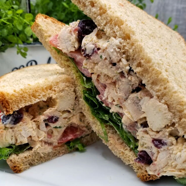 Victors Chicken Salad (cranberries, almonds and light spice) on white or wheat with lettuce and tomato. Ready to take to work or school and enjoy.