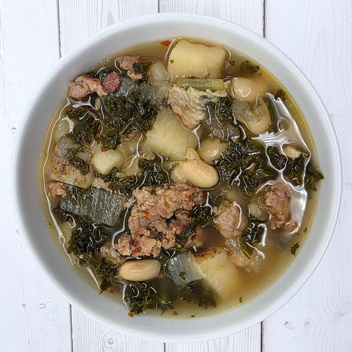 Italian sausage with potatoes, fresh chopped kale, cannellini beans and bacon in a light creamy broth. Hearty, flavorful, and thoughtfully made to warm you through.